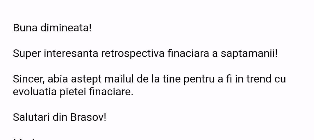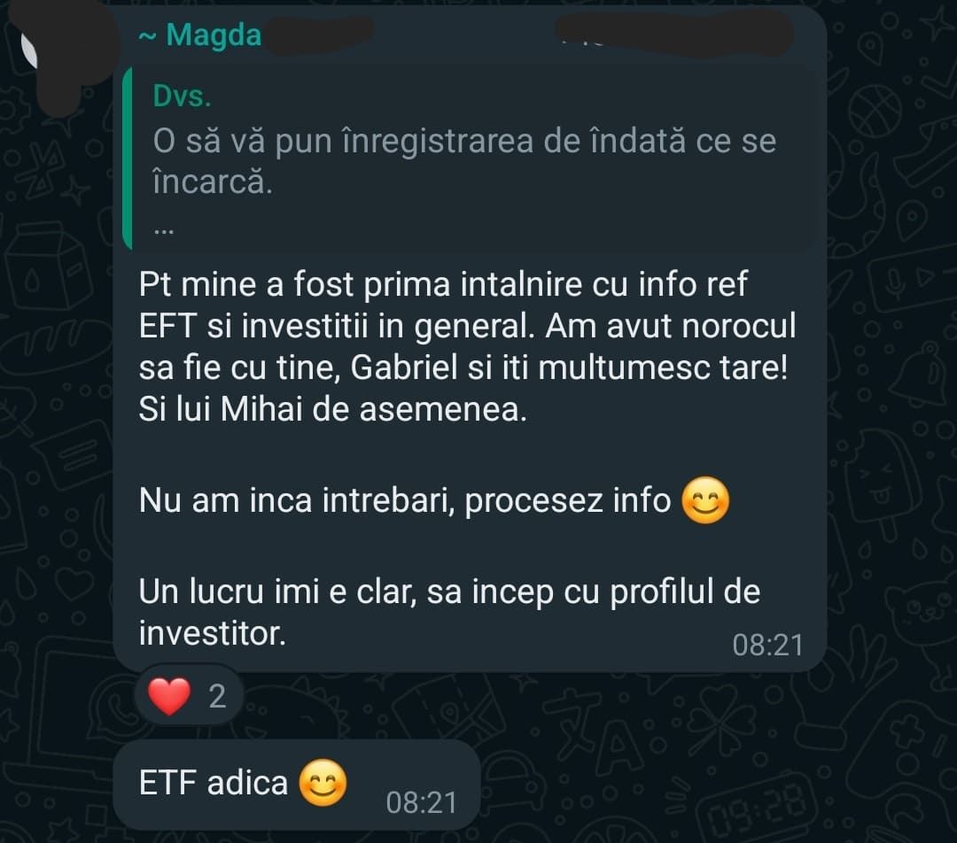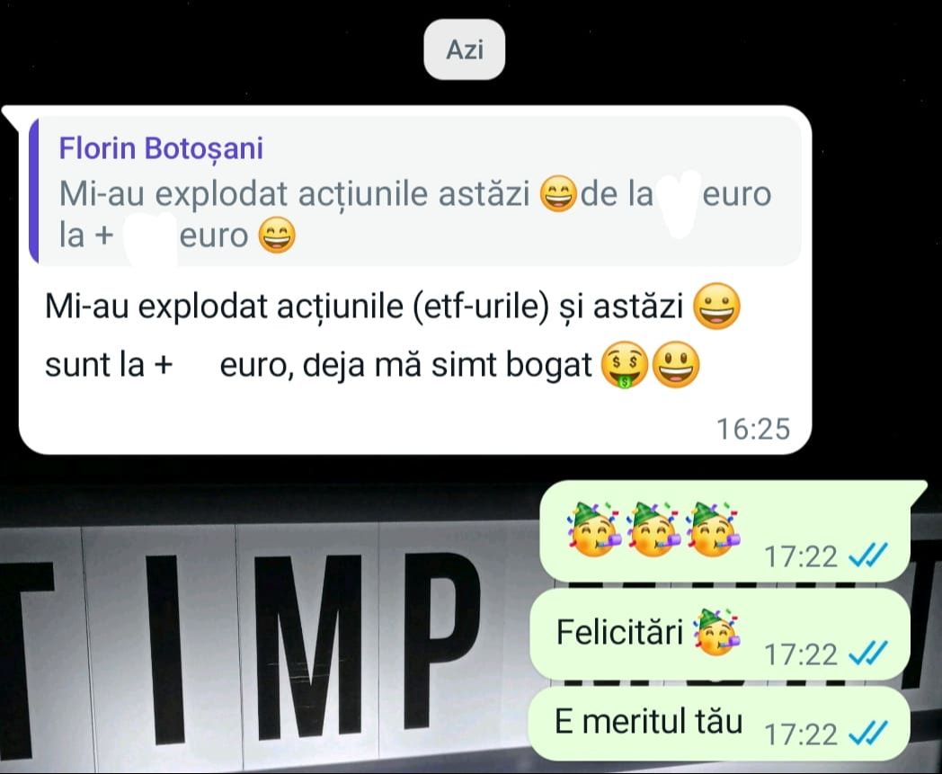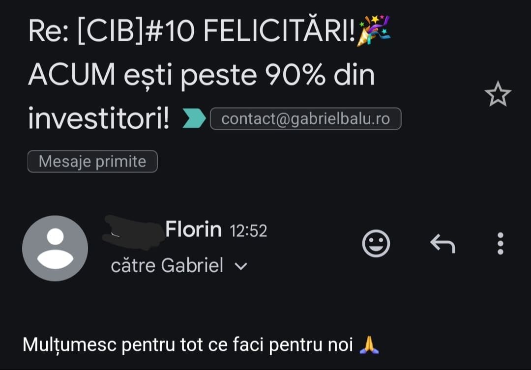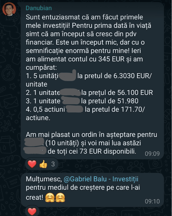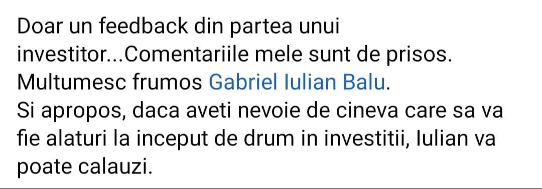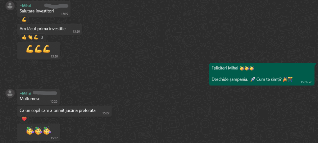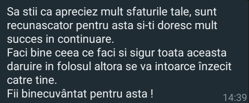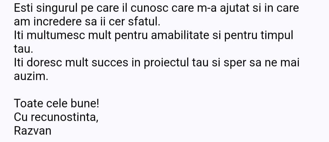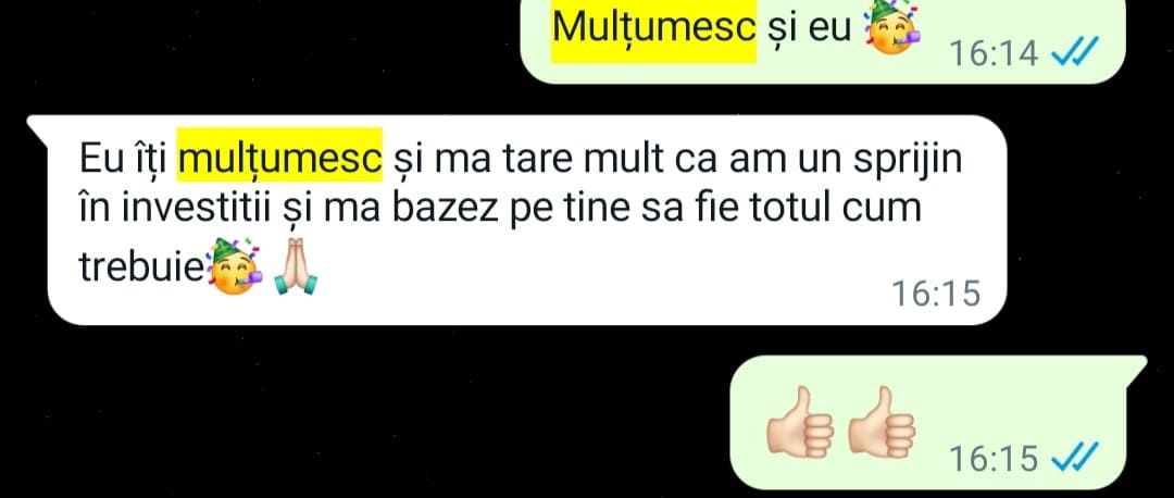„Mulțumesc tare mult că am un sprijin în investiții și mă bazez pe tine să fie totul cum trebuie!”