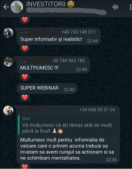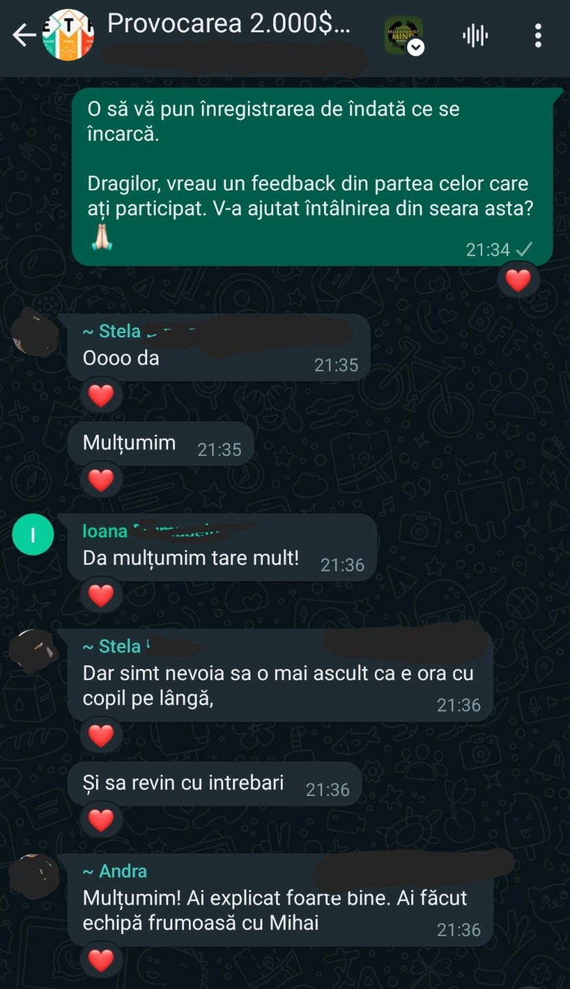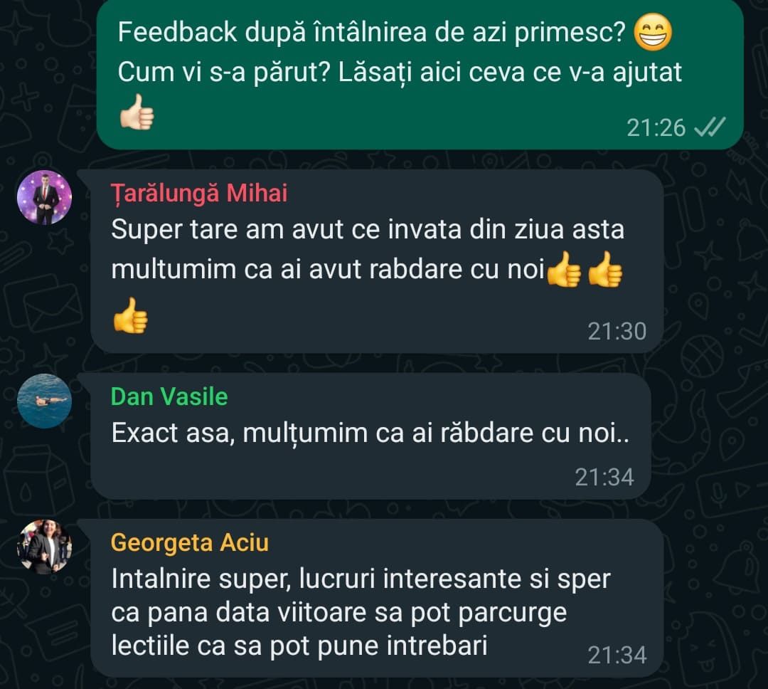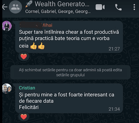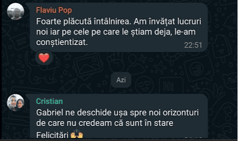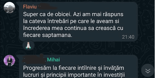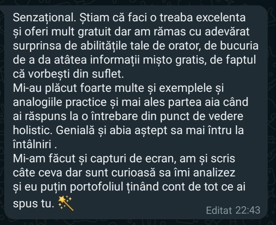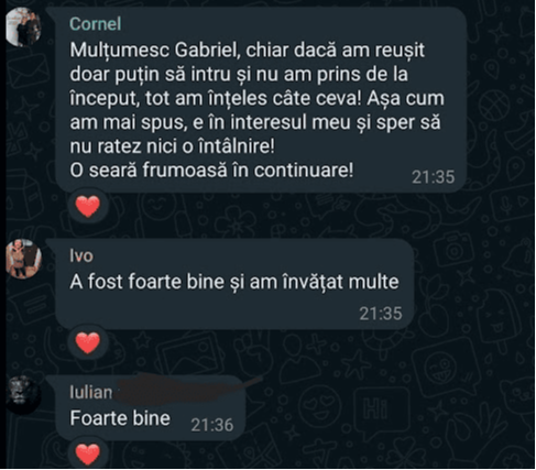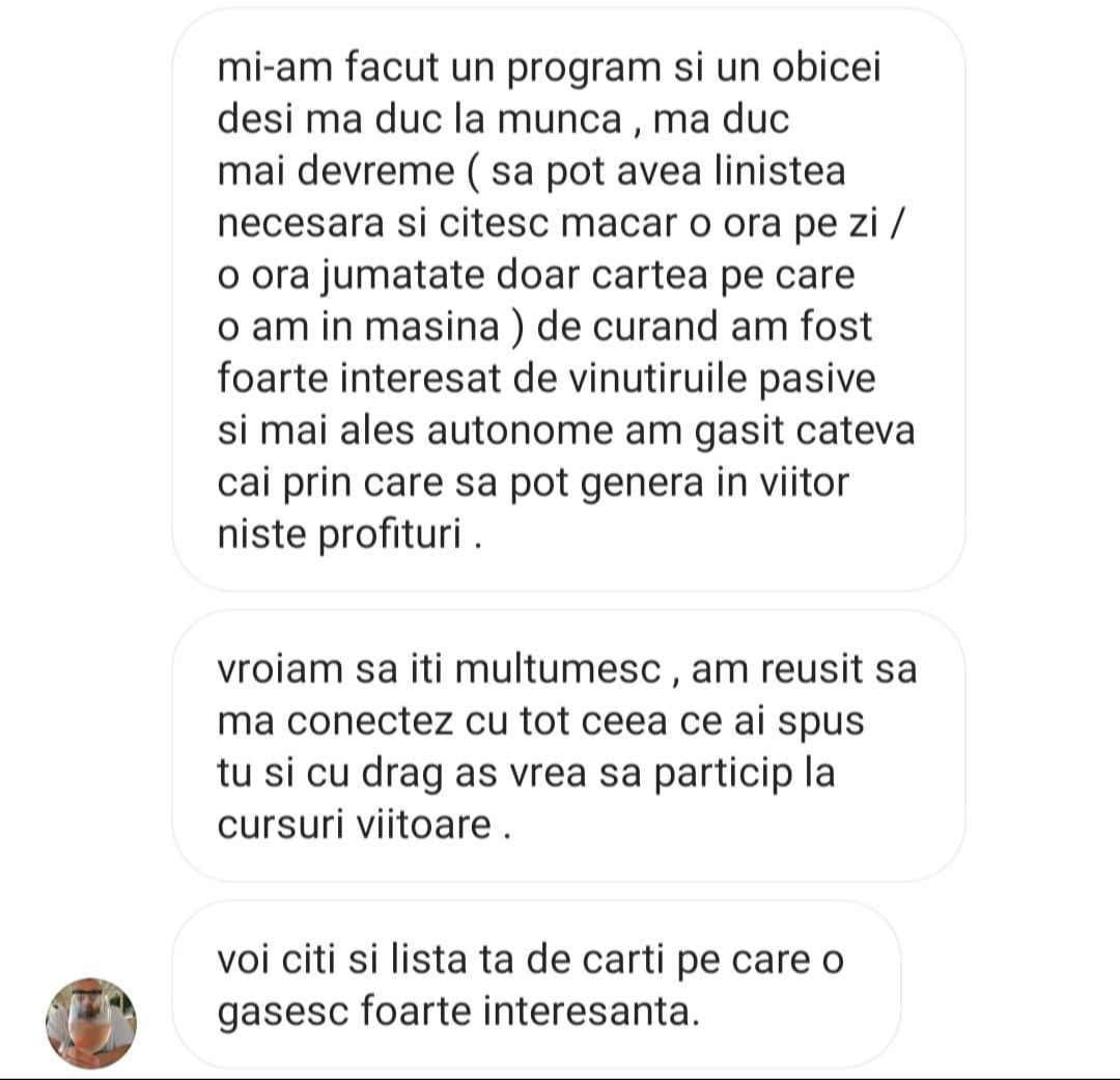 „Pe scurt: Programul – bine structurat, exhaustiv (investitii, mindset, sfaturi) bogat exemplificat la nivel vizual, materiale variate, explicatii foarte aplicate, comunicare excelenta cu realizatorul, atmosfera foarte placuta, entuziasm,