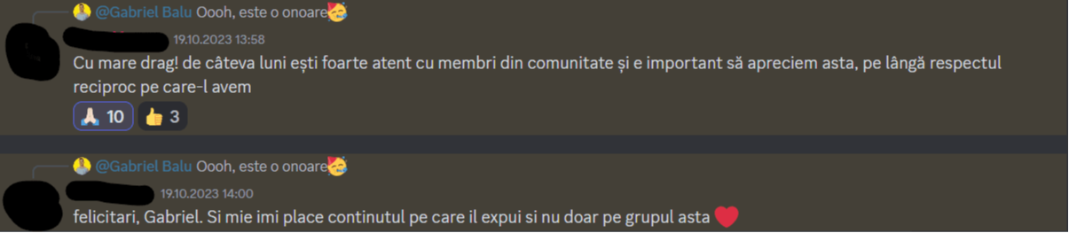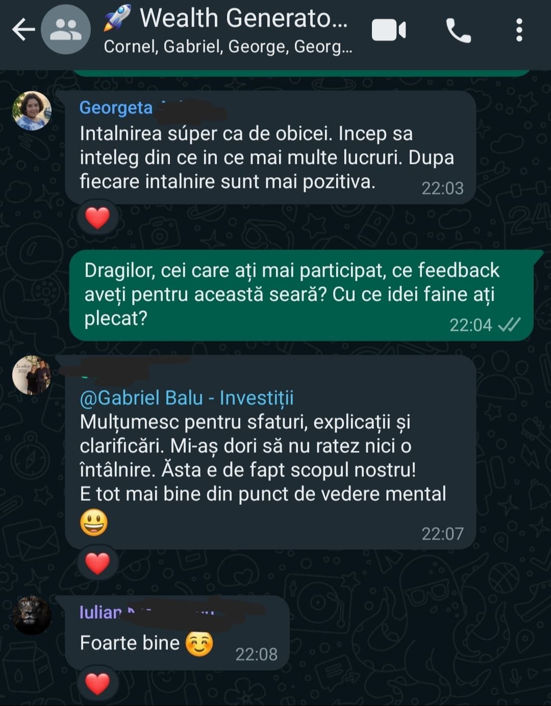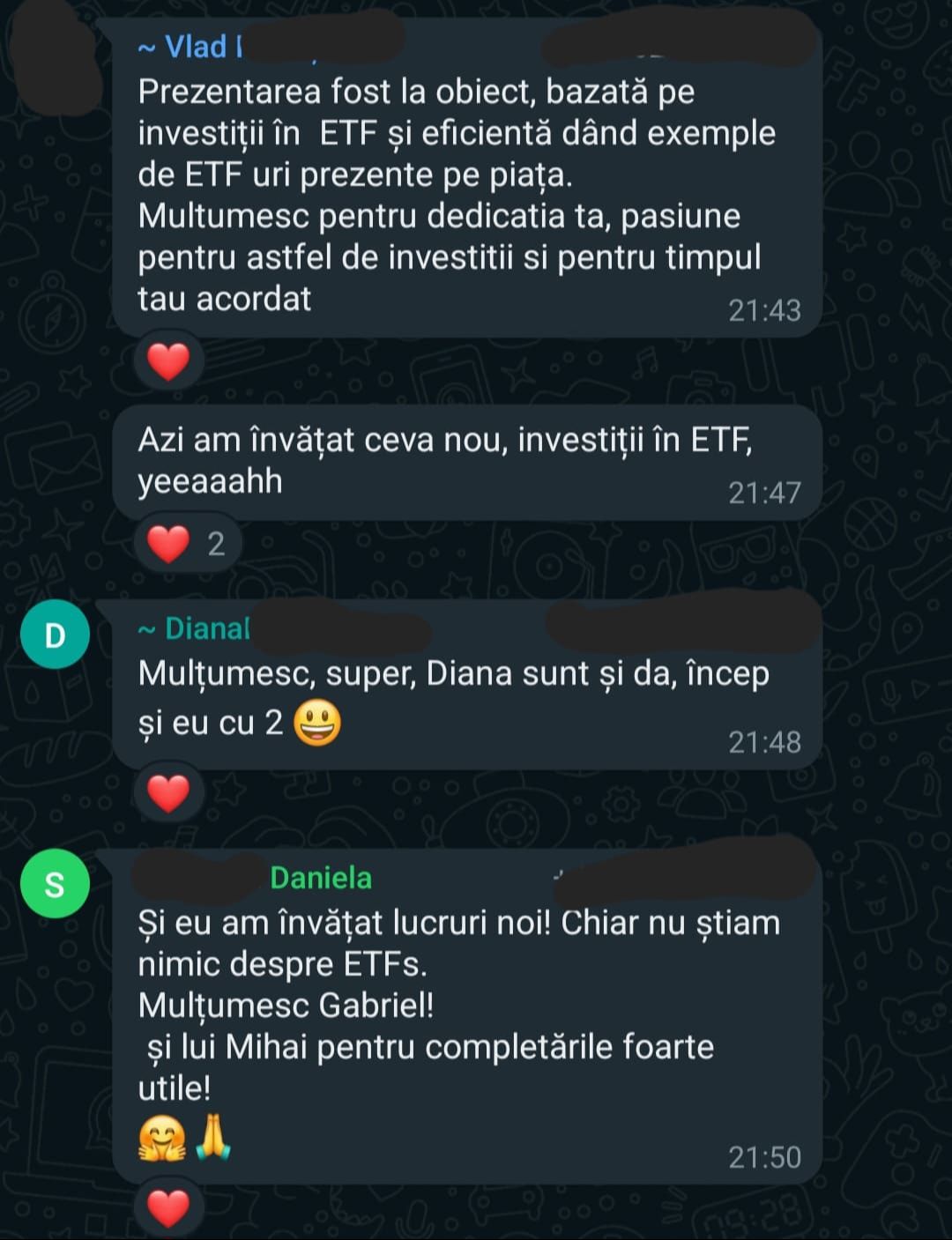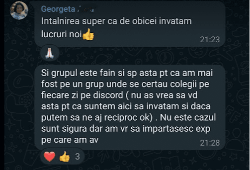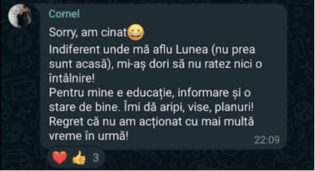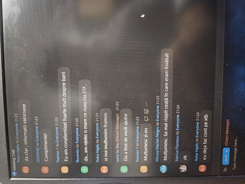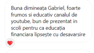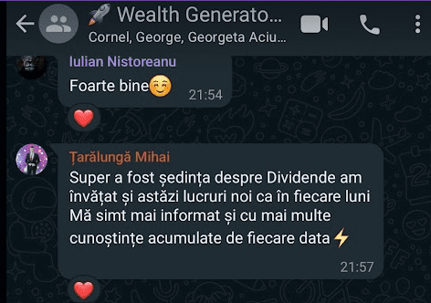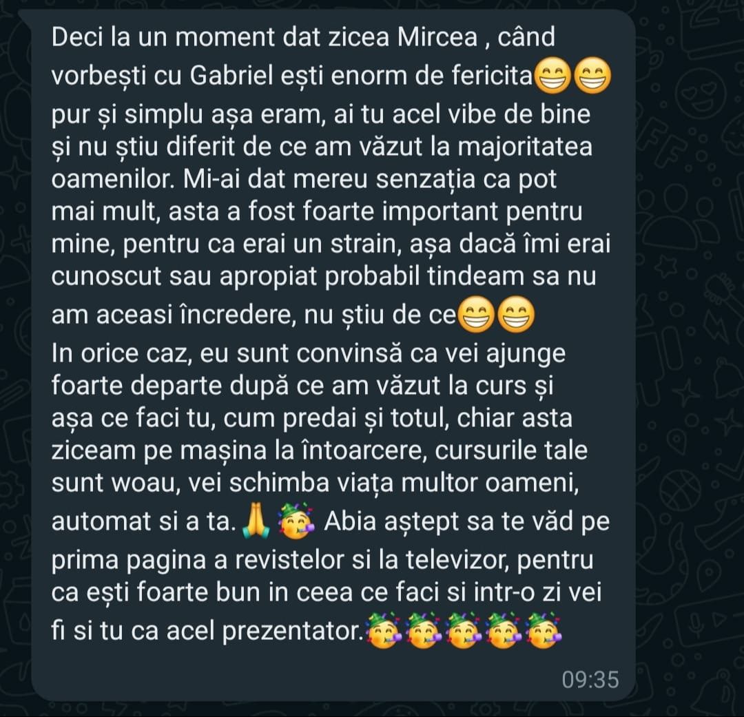 „Pe scurt: Programul – bine structurat, exhaustiv (investitii, mindset, sfaturi) bogat exemplificat la nivel vizual, materiale variate, explicatii foarte aplicate, comunicare excelenta cu realizatorul, atmosfera foarte placuta, entuziasm,