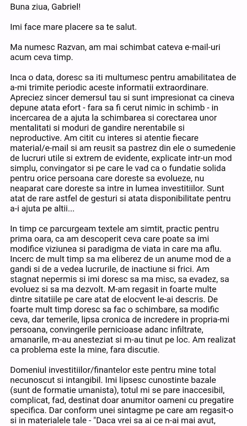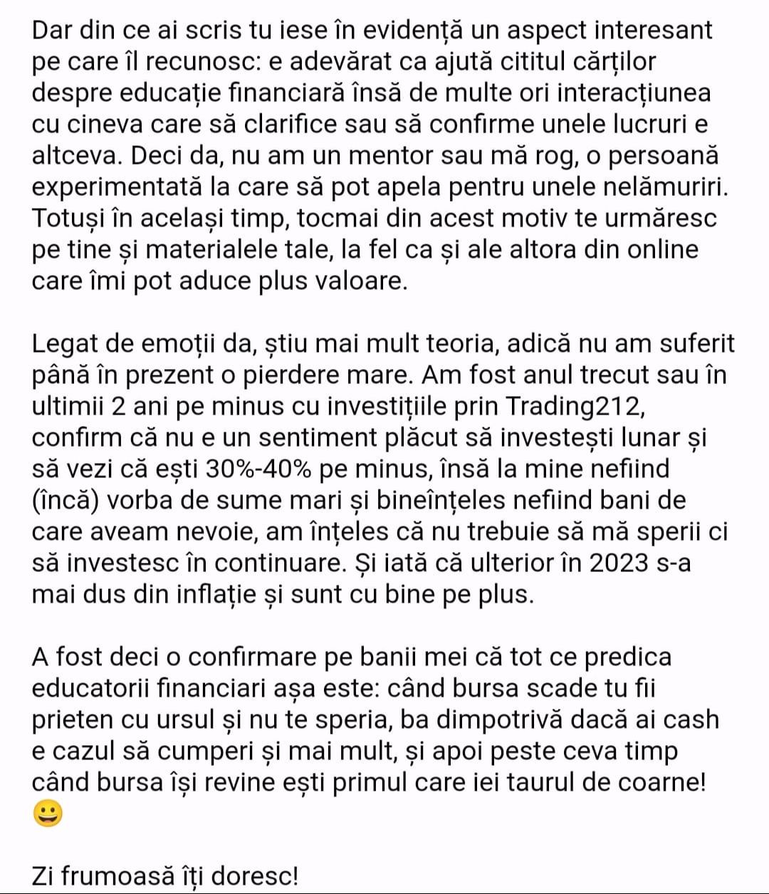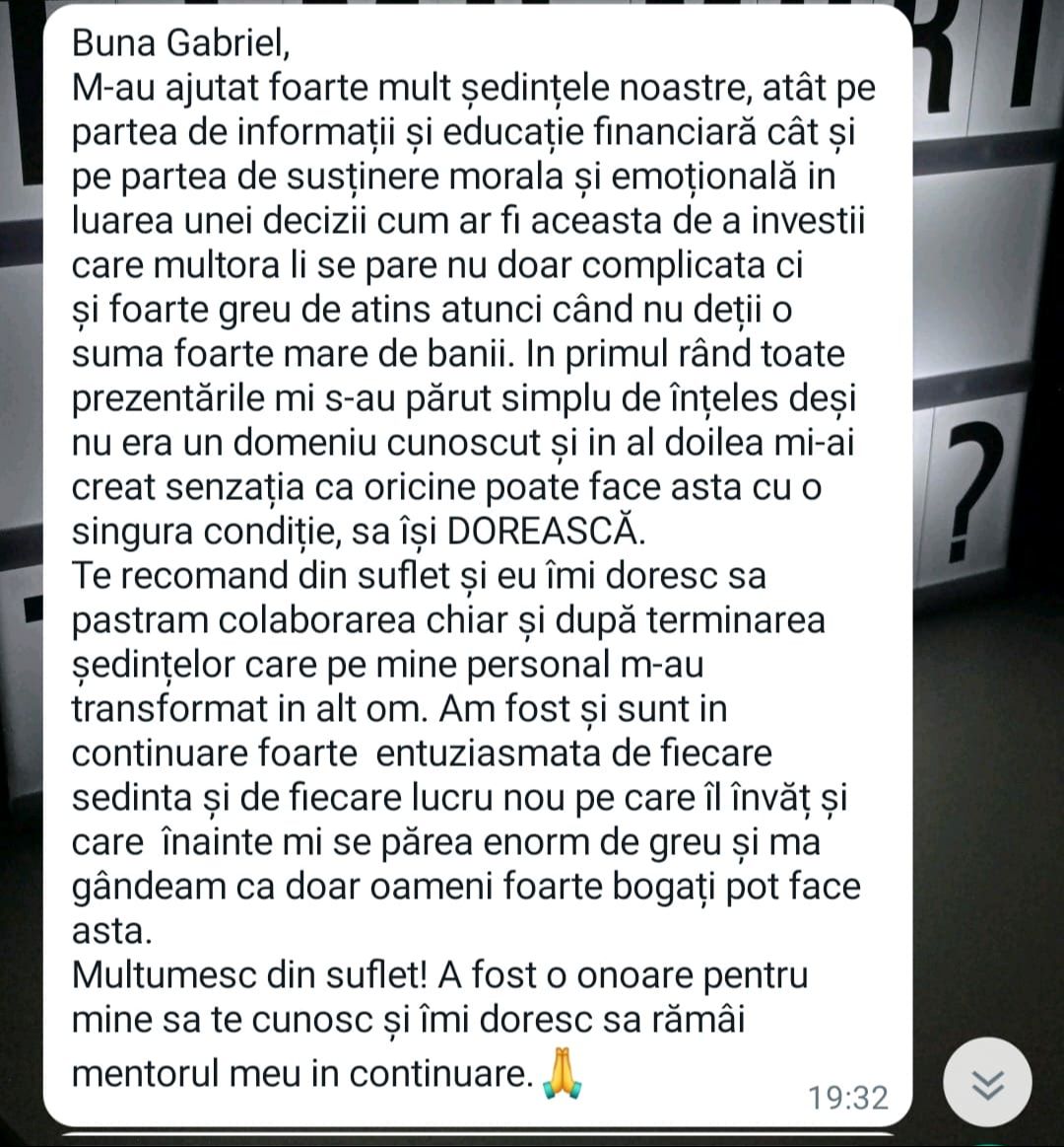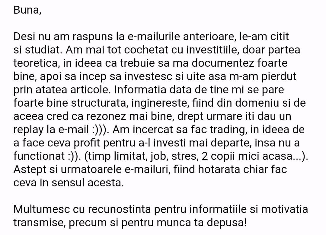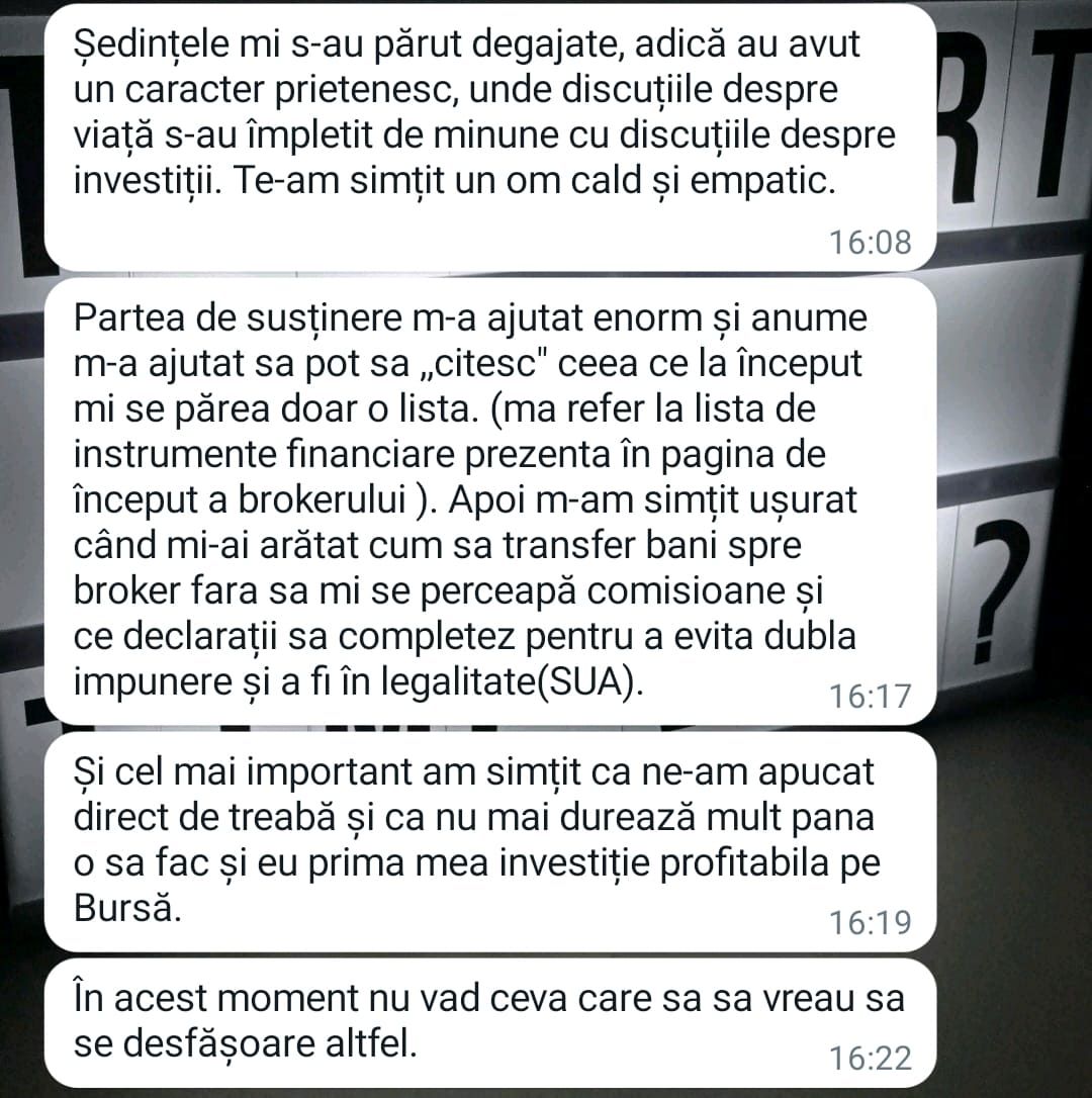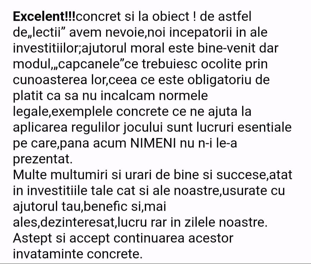Avand in vedere ca acum o luna de zile eram un ilustru ignorant in orice aspect legat de domeniul investitiilor, pot spune ca programul si interactiunea mea cu tine m-au ajutat, intr-un timp atat de scurt, sa acumulez cunostinte variate si extrem de utile pentru cineva care nu doreste sa devina neaparat profesionist, dar care se poate misca liber in domeniu.