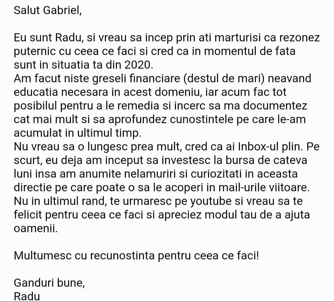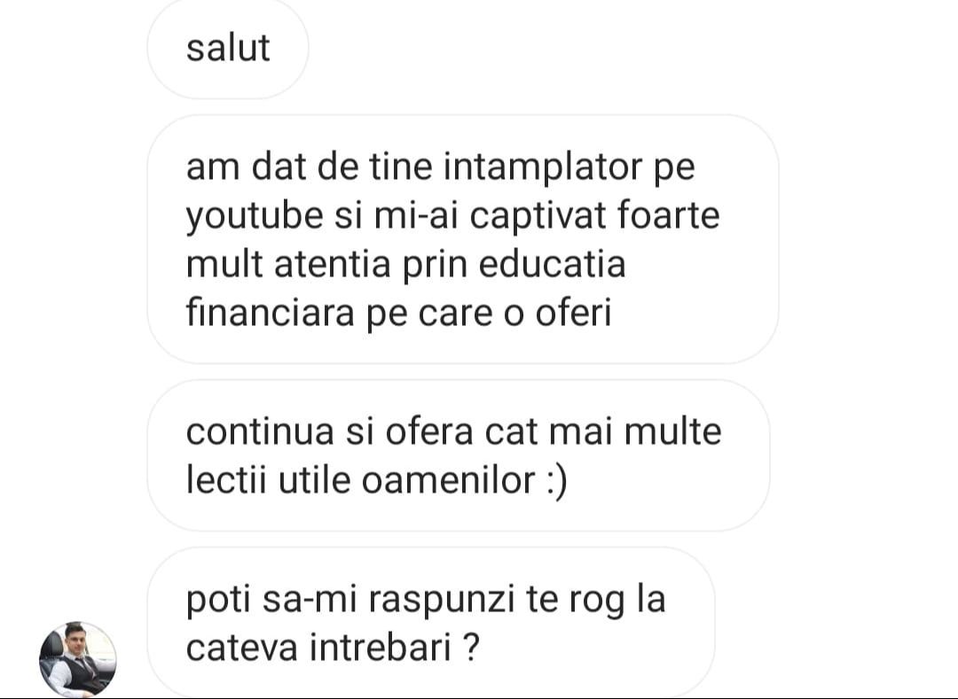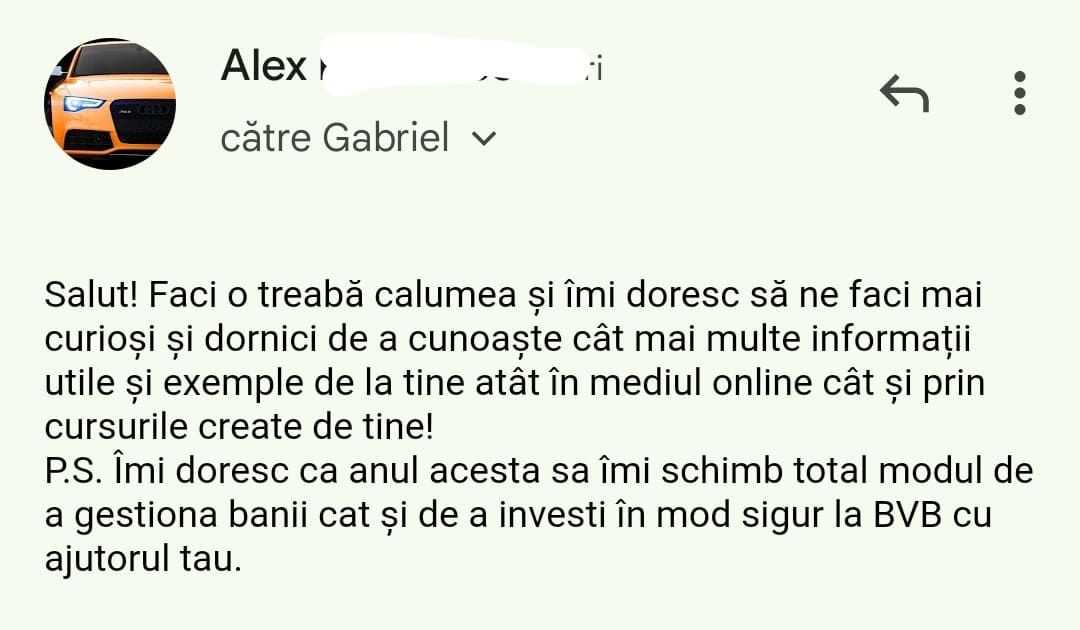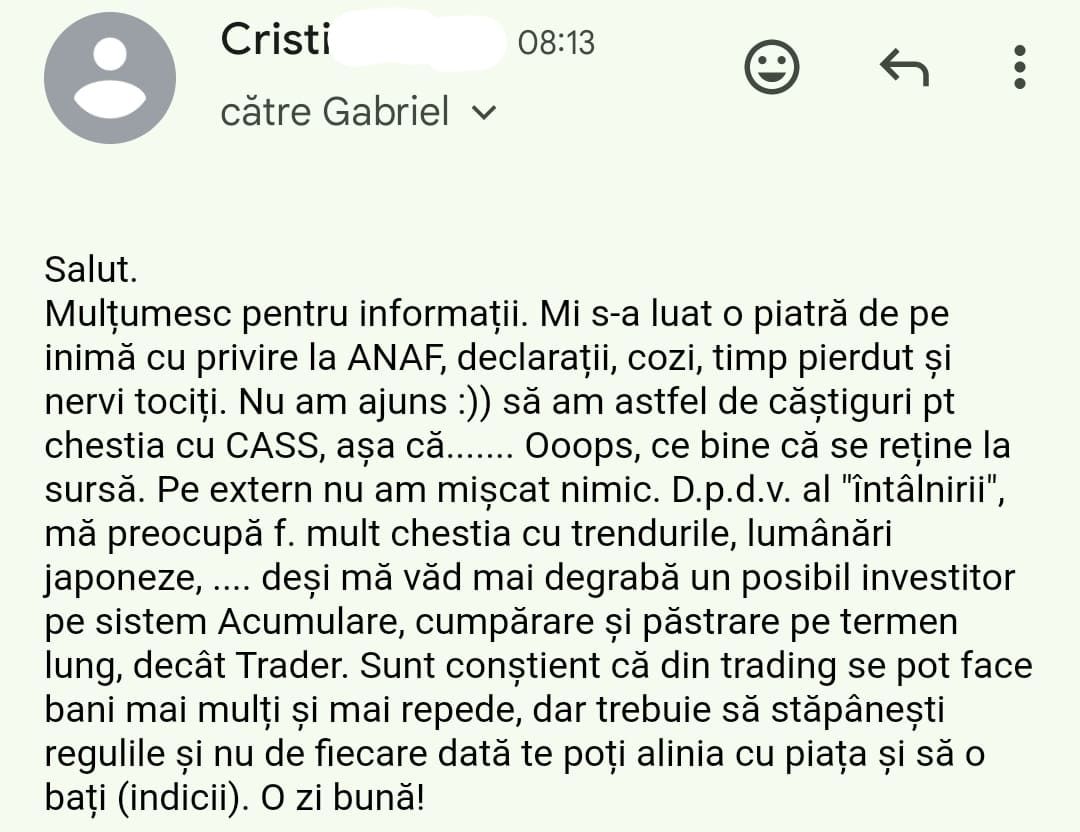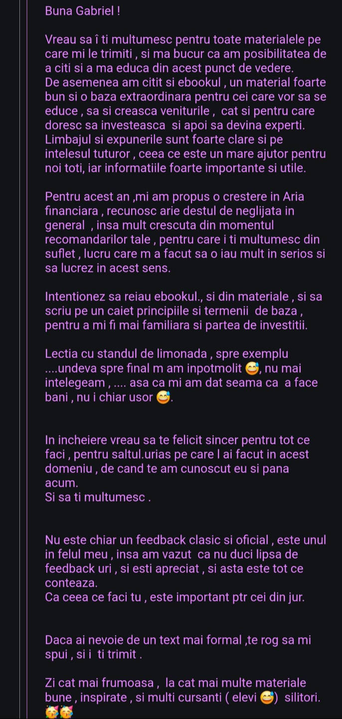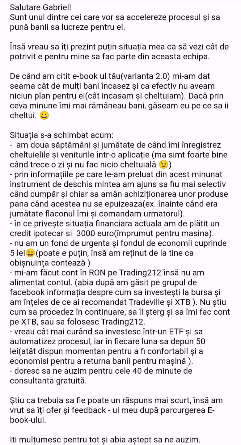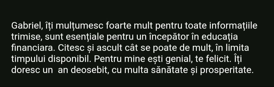 Avand in vedere ca acum o luna de zile eram un ilustru ignorant in orice aspect legat de domeniul investitiilor, pot spune ca programul si interactiunea mea cu tine m-au ajutat, intr-un timp atat de scurt, sa acumulez cunostinte variate si extrem de utile pentru cineva care nu doreste sa devina neaparat profesionist, dar care se poate misca liber in domeniu.
