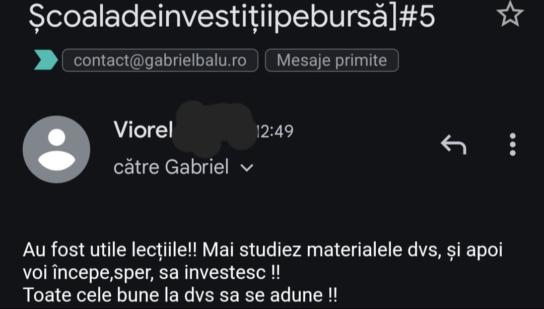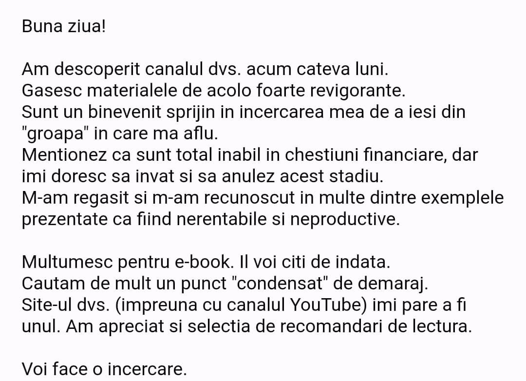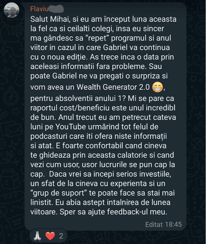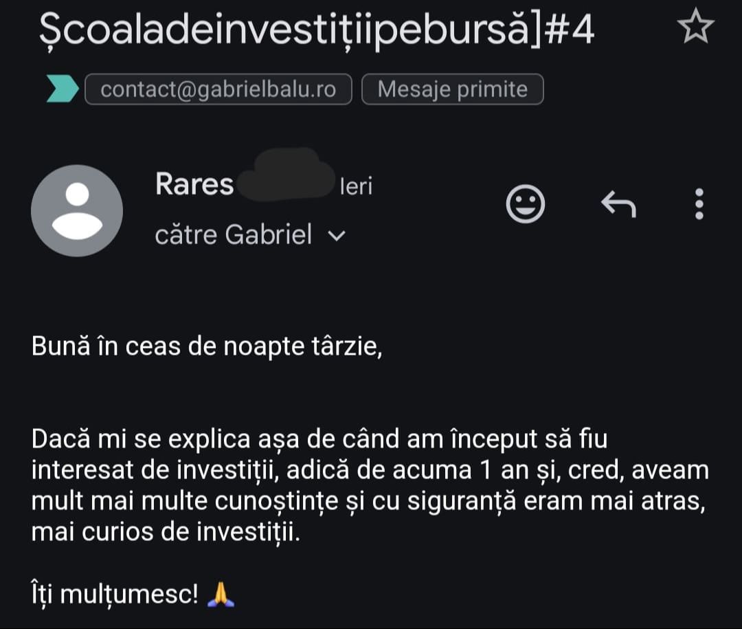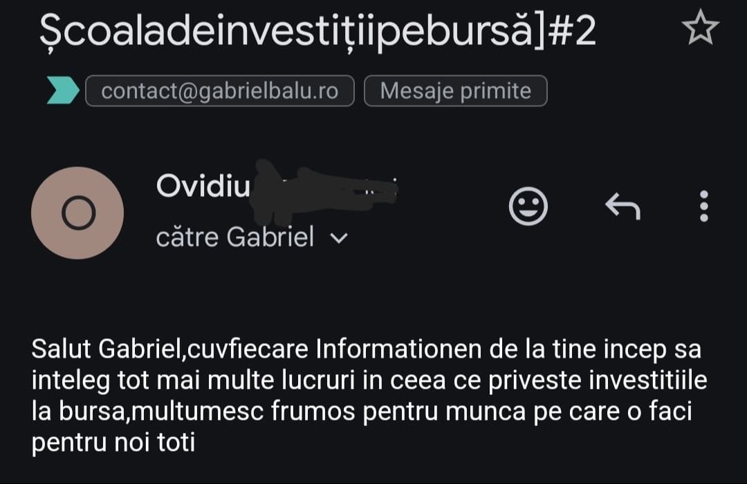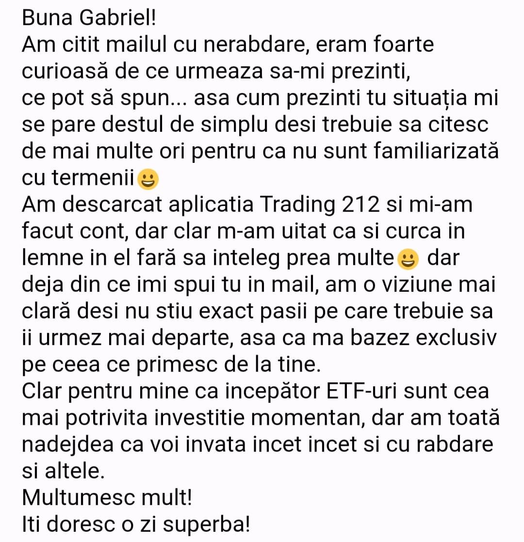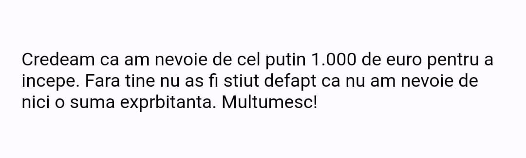 Avand in vedere ca acum o luna de zile eram un ilustru ignorant in orice aspect legat de domeniul investitiilor, pot spune ca programul si interactiunea mea cu tine m-au ajutat, intr-un timp atat de scurt, sa acumulez cunostinte variate si extrem de utile pentru cineva care nu doreste sa devina neaparat profesionist, dar care se poate misca liber in domeniu.