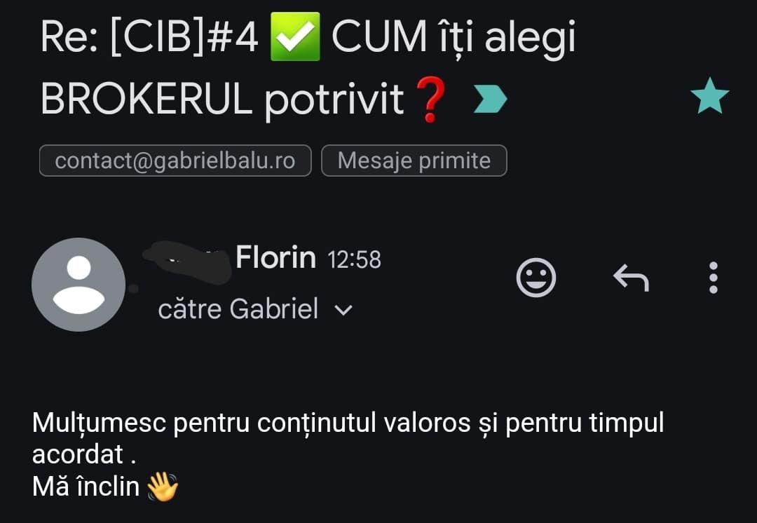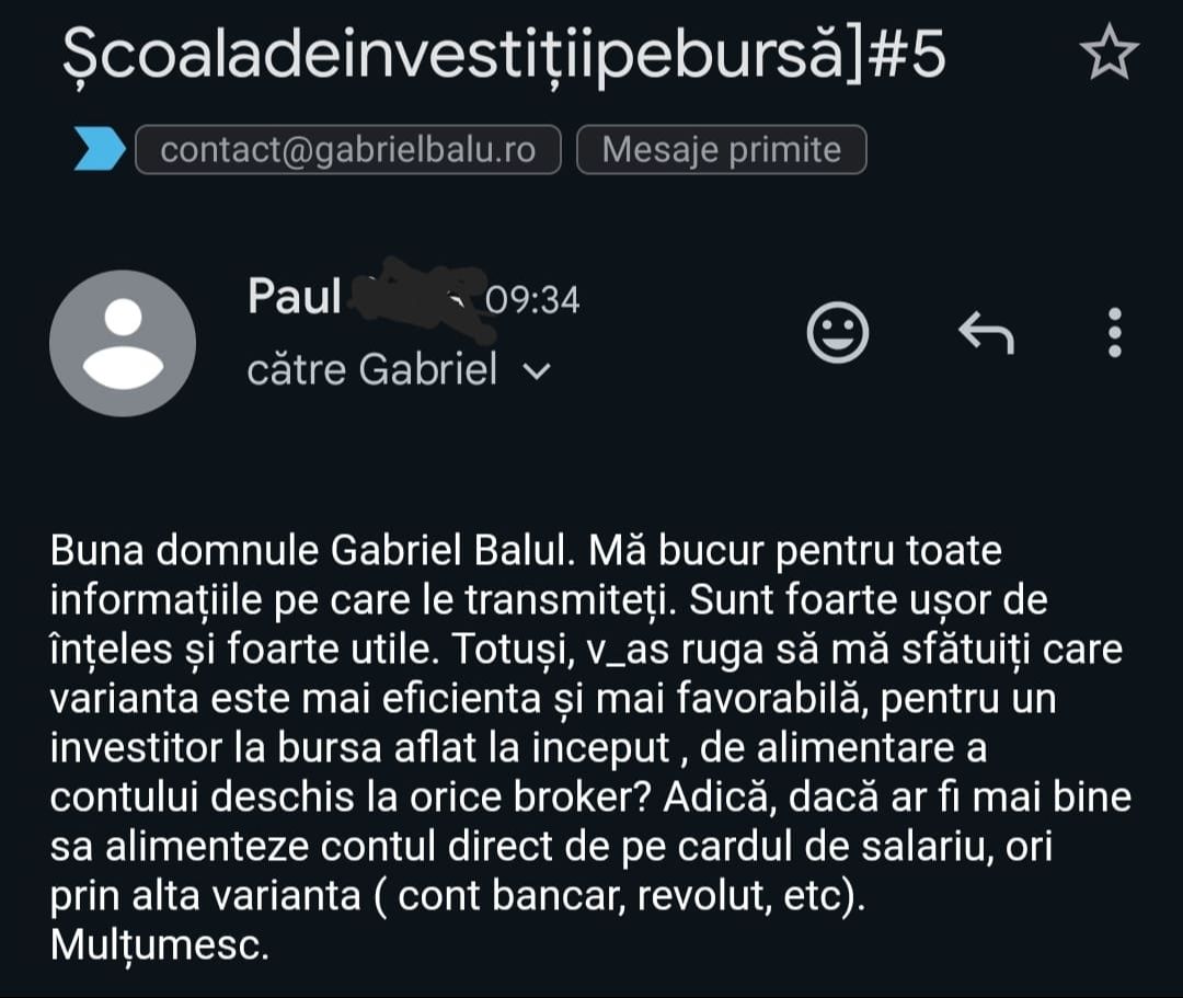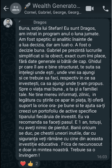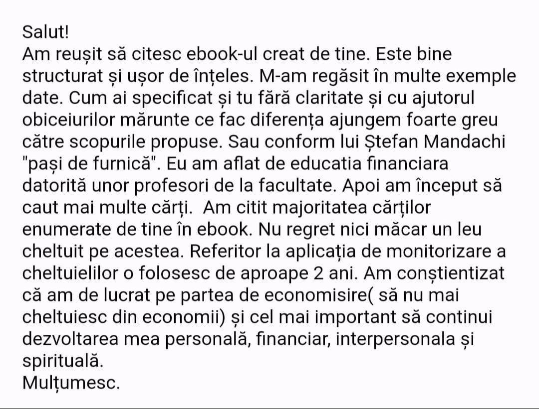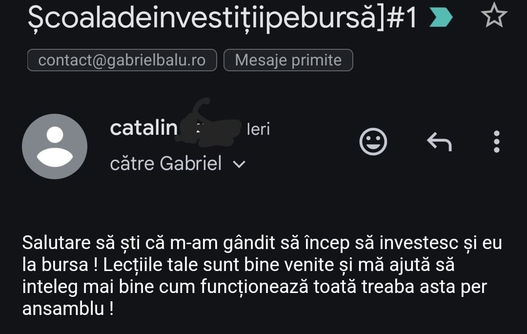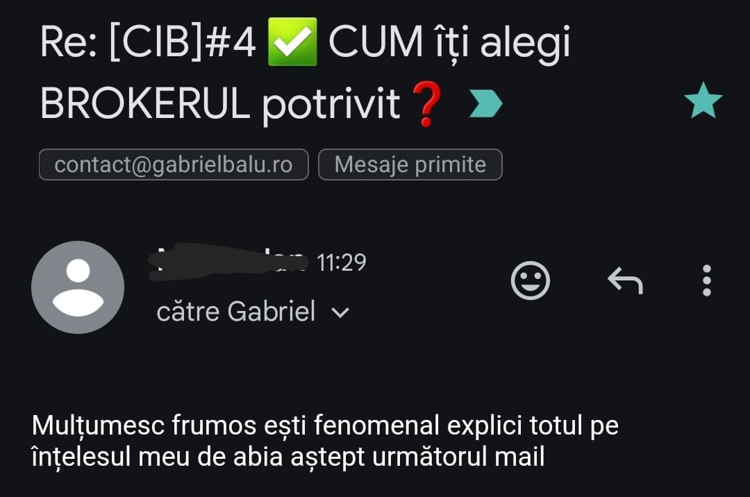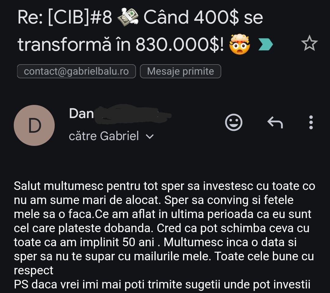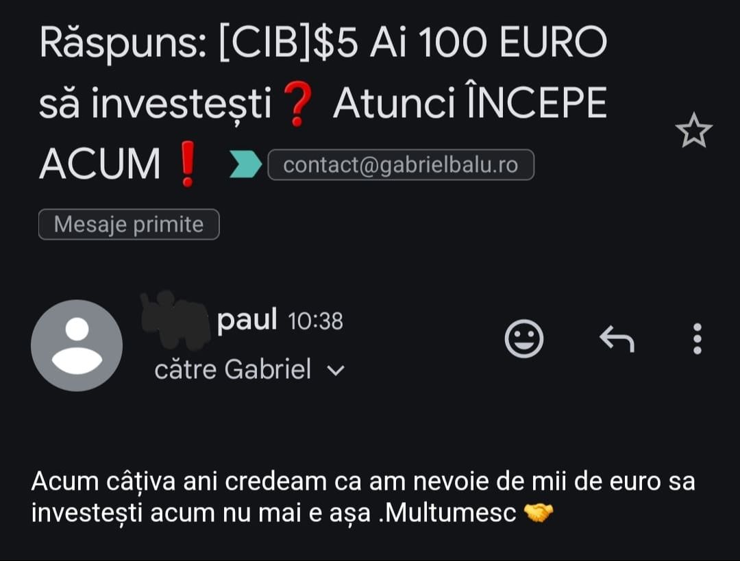 Avand in vedere ca acum o luna de zile eram un ilustru ignorant in orice aspect legat de domeniul investitiilor, pot spune ca programul si interactiunea mea cu tine m-au ajutat, intr-un timp atat de scurt, sa acumulez cunostinte variate si extrem de utile pentru cineva care nu doreste sa devina neaparat profesionist, dar care se poate misca liber in domeniu.