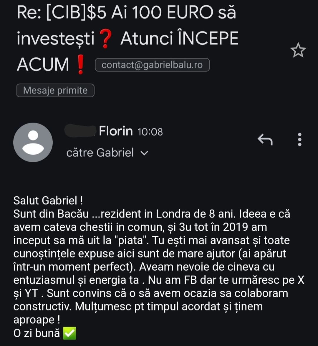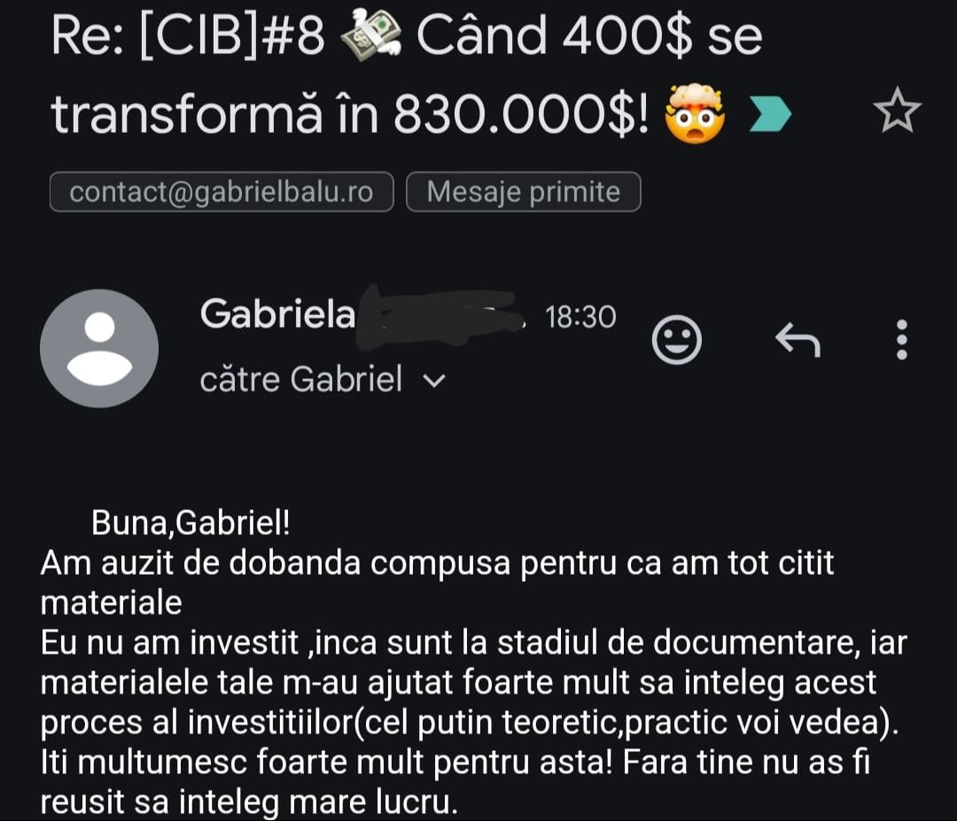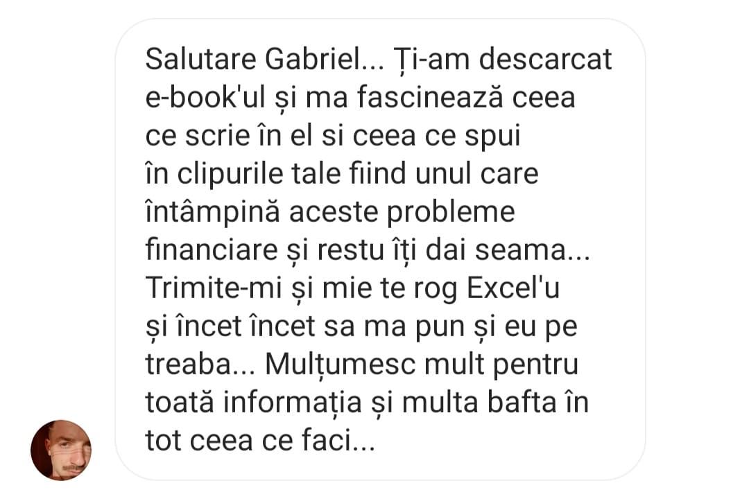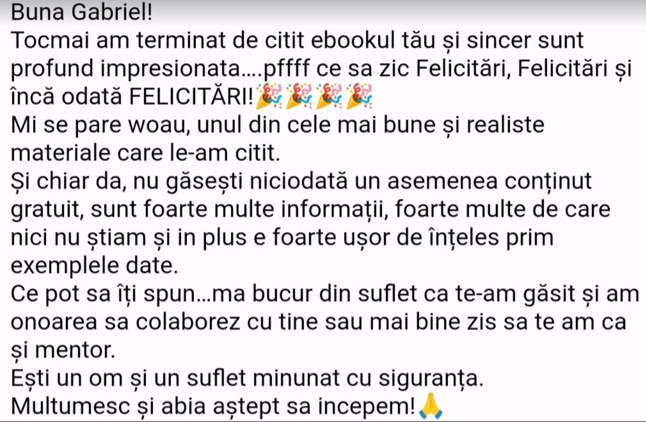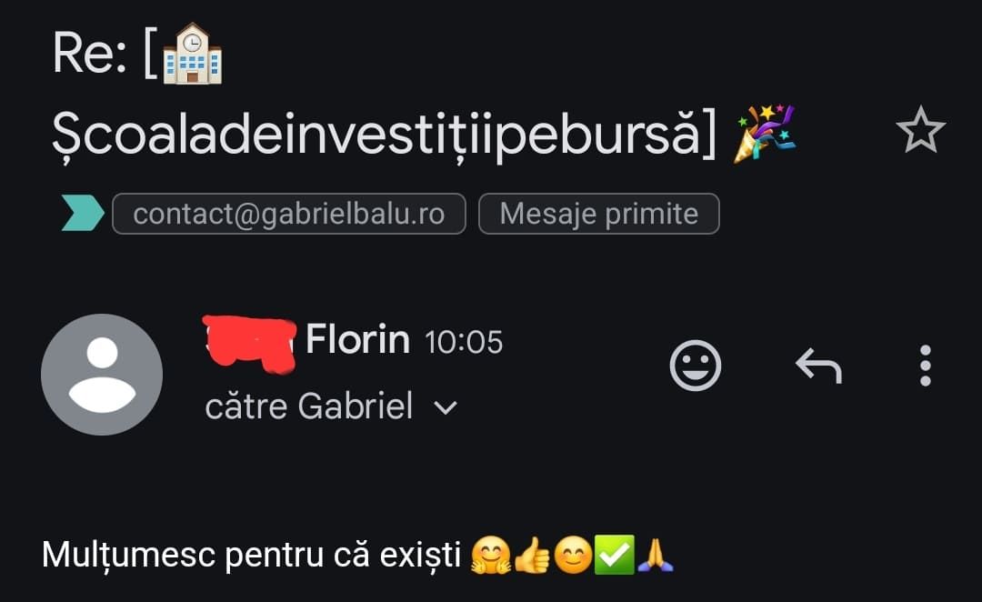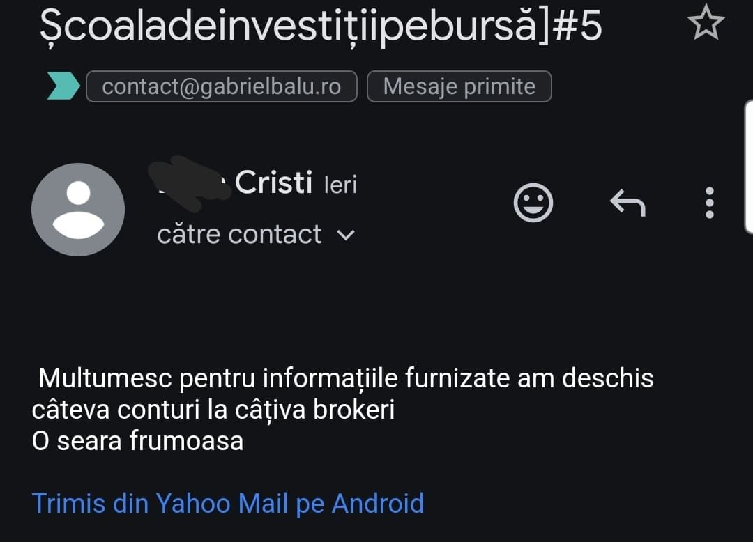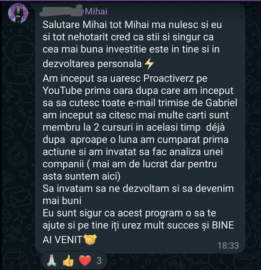 Avand in vedere ca acum o luna de zile eram un ilustru ignorant in orice aspect legat de domeniul investitiilor, pot spune ca programul si interactiunea mea cu tine m-au ajutat, intr-un timp atat de scurt, sa acumulez cunostinte variate si extrem de utile pentru cineva care nu doreste sa devina neaparat profesionist, dar care se poate misca liber in domeniu.