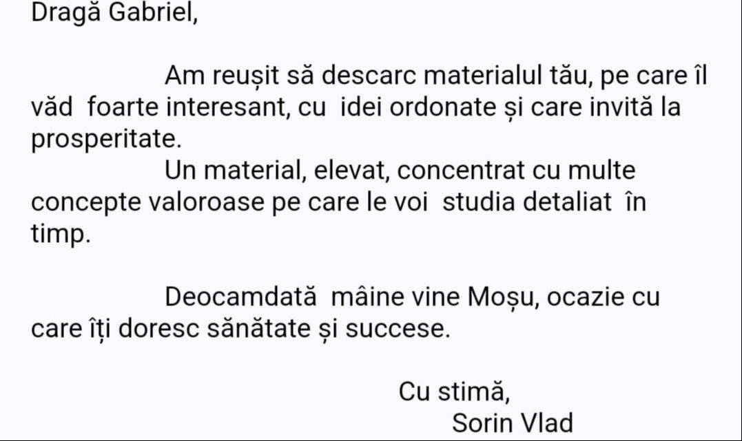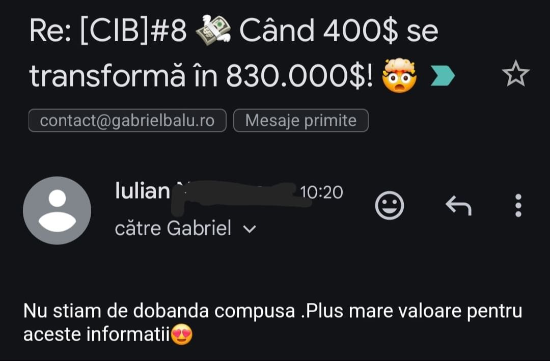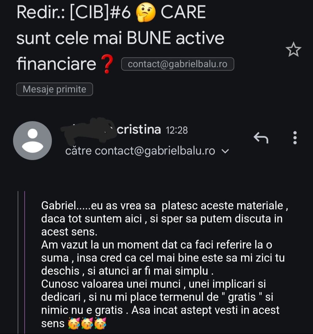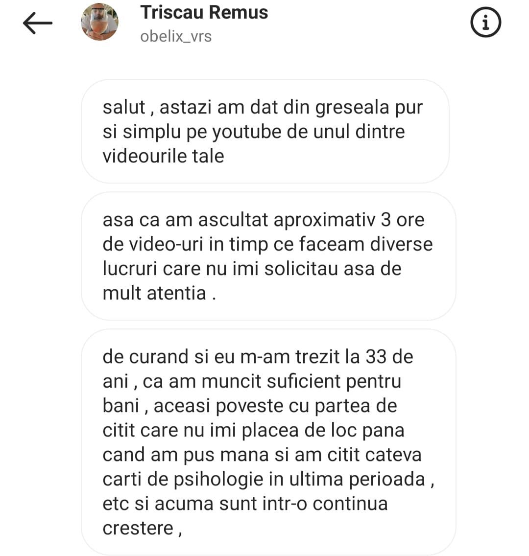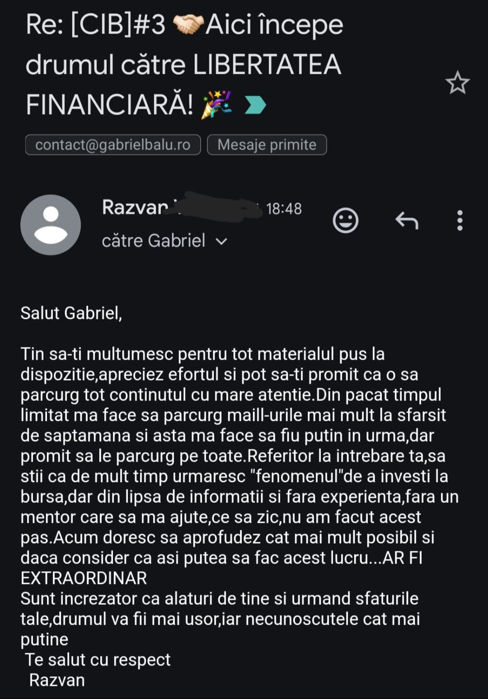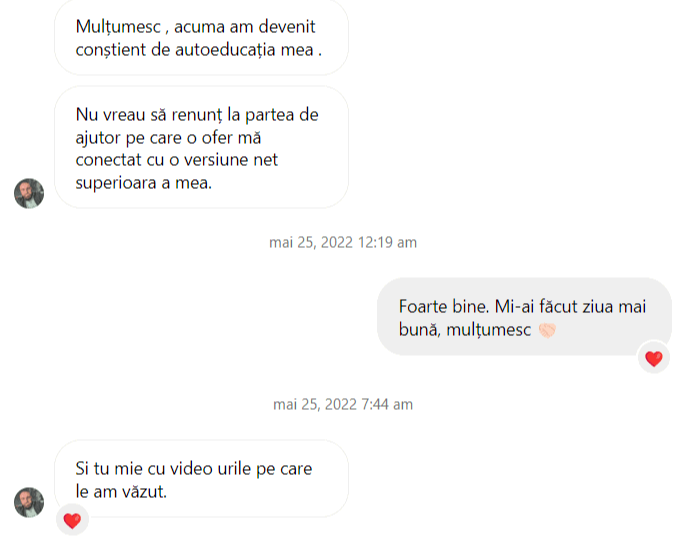 Avand in vedere ca acum o luna de zile eram un ilustru ignorant in orice aspect legat de domeniul investitiilor, pot spune ca programul si interactiunea mea cu tine m-au ajutat, intr-un timp atat de scurt, sa acumulez cunostinte variate si extrem de utile pentru cineva care nu doreste sa devina neaparat profesionist, dar care se poate misca liber in domeniu.