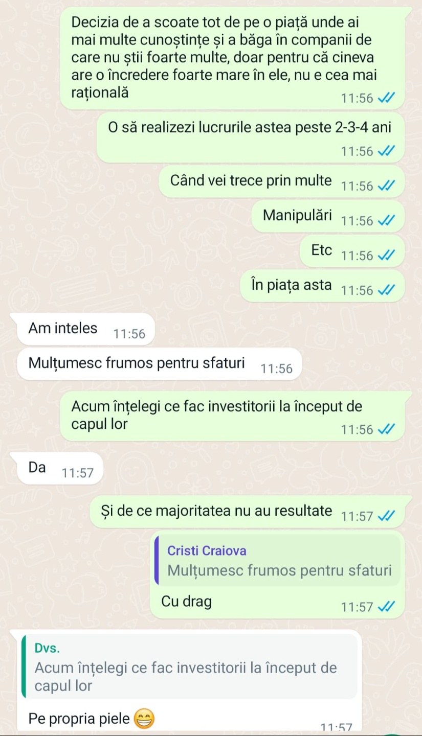 Faptul că m-am concentrat pe ceea ce se întâmplă cu afacerile pe bursă la nivel fundamental (nu cu prețurile acțiunilor) și mi-am creat un control foarte bun al emoțiilor m-a ajutat să obțin randamente peste media pieței!