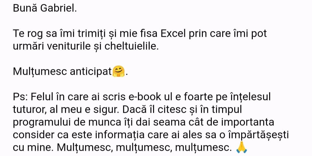 Poți face asta și într-un excel dar eu cred că cel mai bine ar fi să descarci o aplicație care face munca grea pentru tine. Tu rămâi cu munca ușoară, aceea de a introduce zilnic cheltuielile, exact atunci când le faci. Nu durează mai mult de 1 minut.